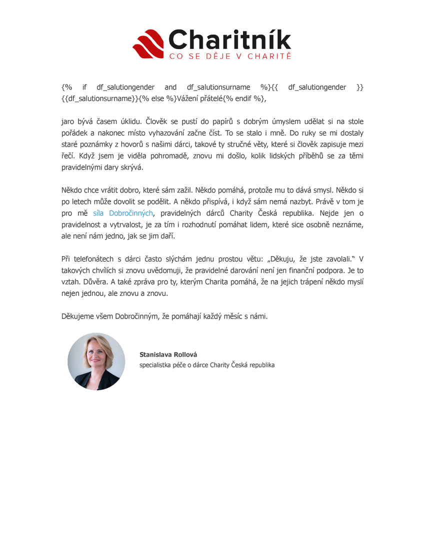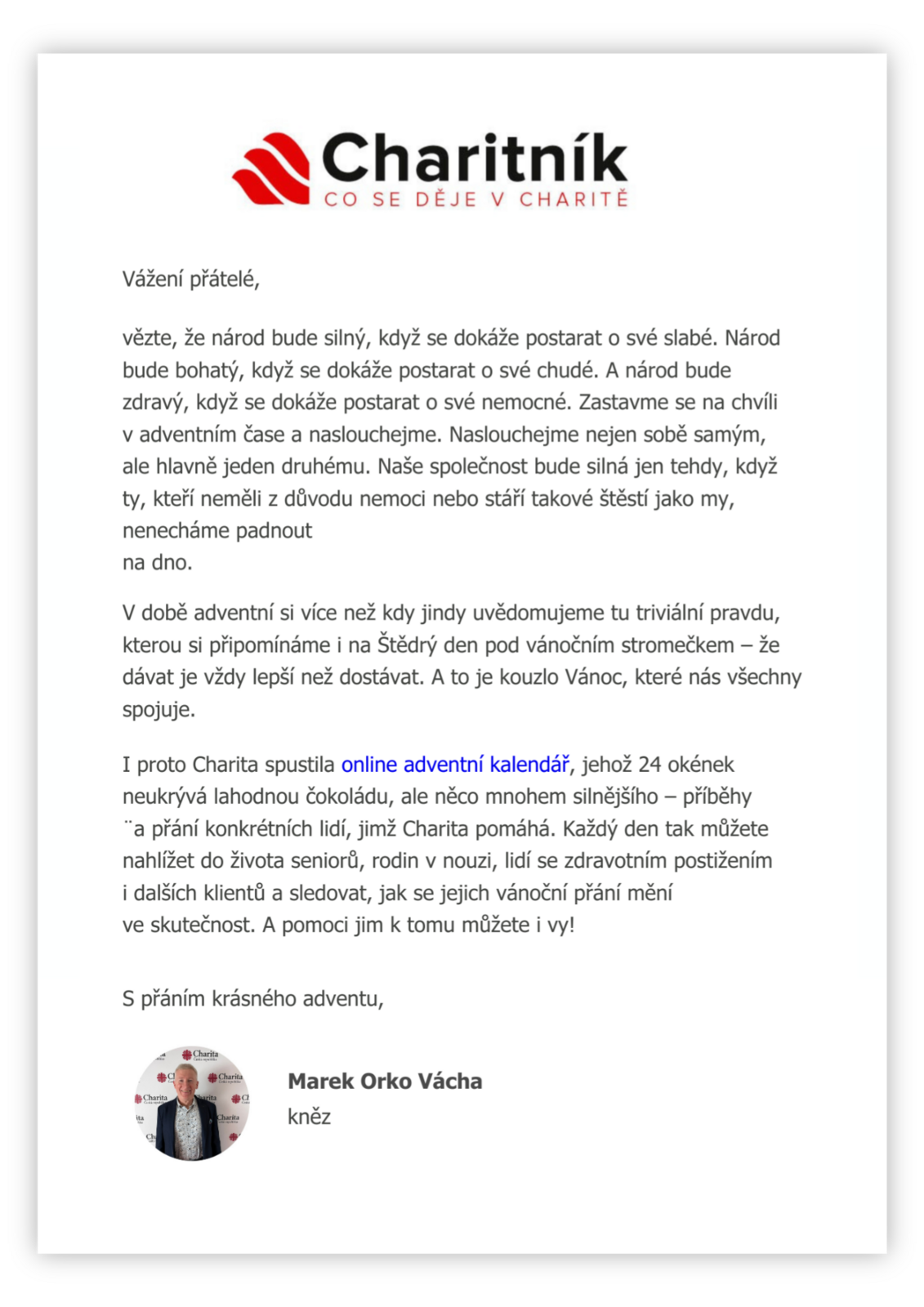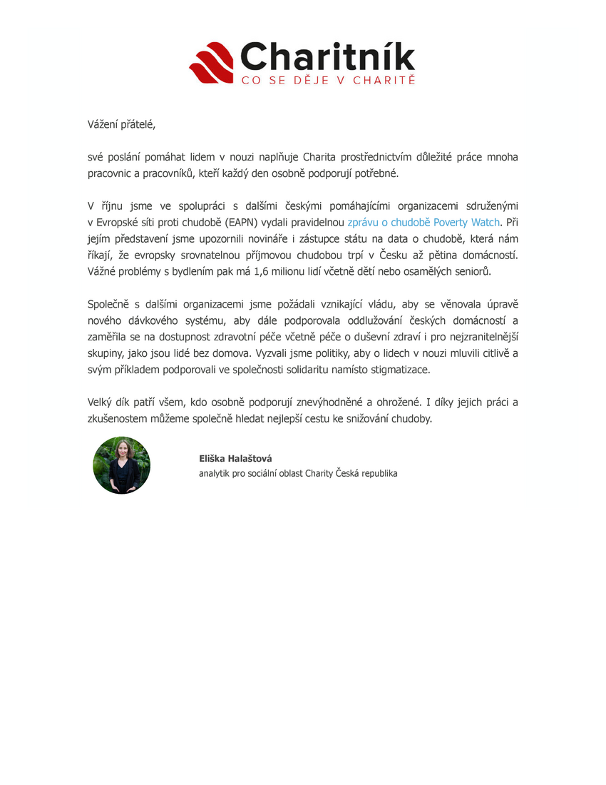 Buďte v obraze s naším Charitníkem. Dozvíte se o světě, který společně měníme k lepšímu. Měsíční dávka zajímavých příběhů z domova i ze zahraničí, chystaných akcí, aktualit z našeho podcastu ChariTALK a především spousty dobrých zpráv, které dávají naší práci hluboký smysl.