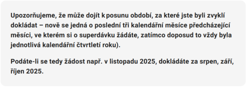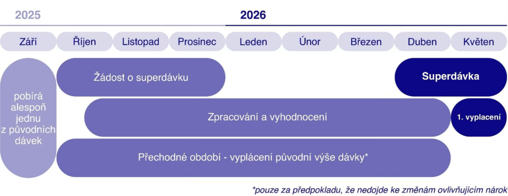 Pokud už dávky pobíráte, musíte nejpozději do 31. prosince 2025 podat novou žádost o superdávku, abyste se vyhnuli přerušení podpory. Do dubna 2026 budete ještě dostávat dávky ve stávající výši a od května 2026 začne výplata podle nových pravidel.