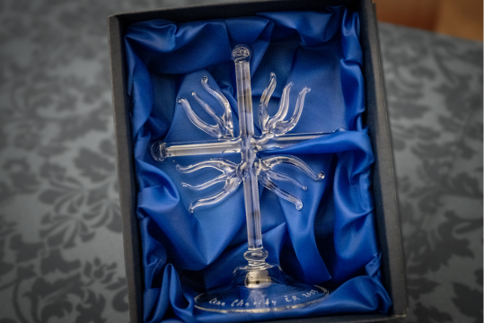 Již tradičním symbolem Ceny Charity je autorská skleněná soška v podobě plamenného kříže z dílny novoborského sklářského mistra Davida Wünsche.