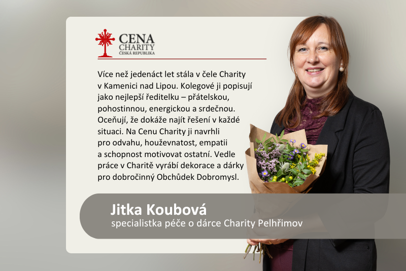 Jitka Koubová (nominována Diecézní charitou České Budějovice) – dlouholetá ředitelka Charity Kamenice nad Lipou a dnes koordinátorka Tříkrálové sbírky Charity Pelhřimov, oceněná za odvahu, empatii a schopnost inspirovat druhé.